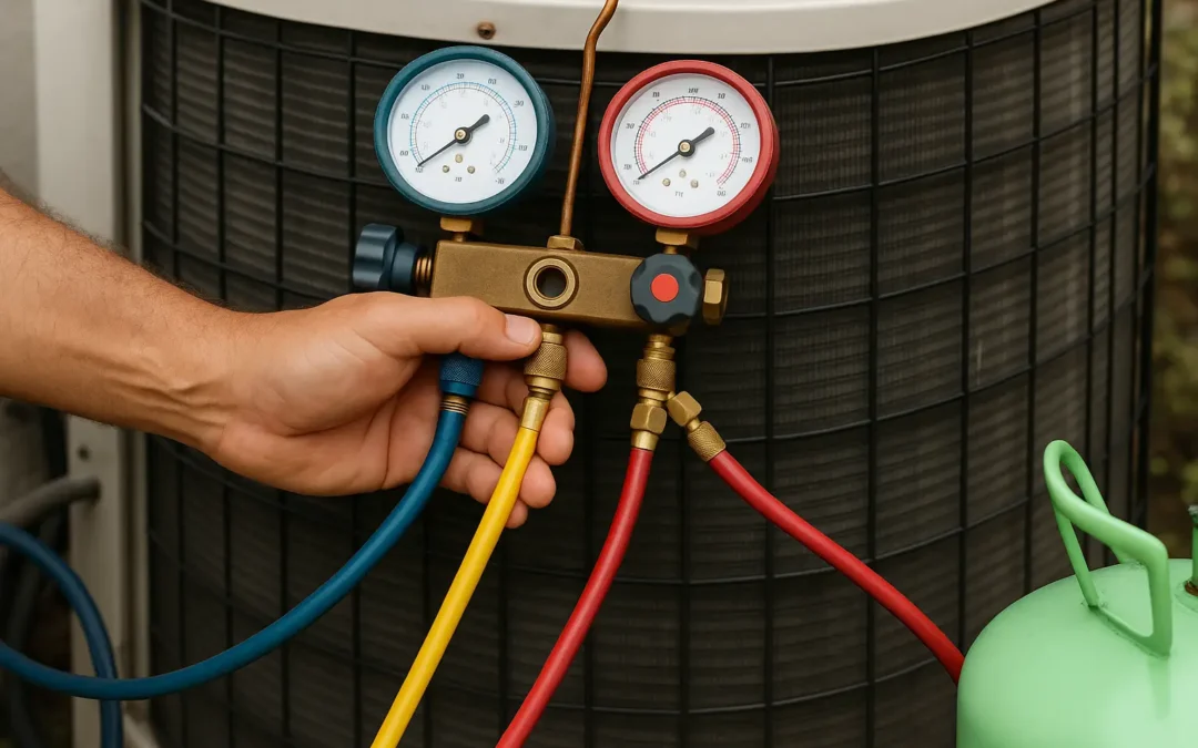 HVAC technician adjusting manifold gauge set with red, blue, and yellow hoses during air conditioning unit maintenance next to a green refrigerant tank.